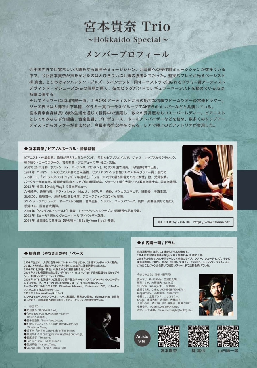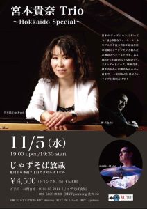 11/05 (Wed) ~Hokkaido Special~宮本貴奈 Trio@じゃずそば放哉(旭川市) 【時間】19:00開場 / 19:30開演 【会場】じゃずそば放哉 【住所】旭川市6条通7丁目エクセルA1ビル 【料金】¥4,500(ドリンク別、当日¥5,000) ご予約・お問合せ:0166-85-6911(じゃずそば放哉) 090-5229-2009(MKT planning 佐々木) 【出演】 宮本貴奈(pf&vo) 柳 真也(b) 山内 陽一郎(dr)